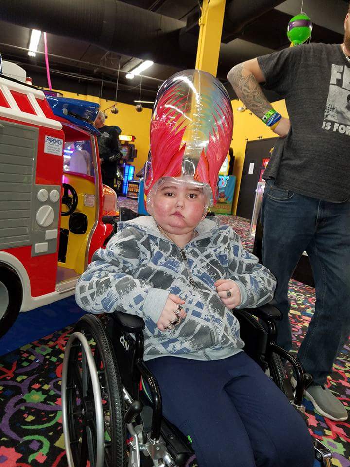 We arrived at Great Wolf Lodge on Friday, and Payton was in a good mood. All of the kids were excited. We checked in and pushed Payton in his wheelchair to our room. The kids went back and forth between our rooms which were across from one another. Everyone wanted to go to the water park but everyone was also hungry. We ordered pizza. Jason went down to the hotel restaurant to get Payton some mashed potatoes and macaroni and cheese since he could not eat pizza. Payton ate a few bites of each, but it was very difficult for him. We finished eating and took the kids down to the water park. Payton and I got in the pool, I felt everyone staring at me helping him walk. I did wonder what they thought of my precious, obviously over weight little boy who could barely walk himself, but it didn’t bother me. Payton would have never thought twice about taking his shirt off at a pool before, but he wanted to keep his shirt on, which made me feel bad but I respected his decision. He held onto me so close in the pool. I just held him and carried him around in the water, loving the closeness. A pool basketball came our way and Payton grabbed it. He backed away from me and we started playing catch. Alexis and Alivia soon joined us and we all had fun throwing the ball to each other. Then Payton decided he wanted to go do something else. We walked over to the built-in water guns and shot at each other for a second. Then I suggested we find my sister and her kids. They were in the small kiddie area. I asked Payton if he wanted to go down one of the slides, which he did. I walked him up the stairs and he went down. He didn’t show much excitement and wanted to go on a bigger slide. I was trying to avoid the big slides because the stairway is very tall with a lot of steps. Jason walked him up to go on one of the medium slides instead. That may have been more difficult, as it is sort of an obstacle course to get to the slides. They got all of the way up there and the slides closed as some kid had pooped somewhere. My heart broke for Payton because I knew how hard it was for him to get up there. We went in the hot tub for awhile before heading back to the room to change clothes to go to the arcade. Payton loved playing games there and won a lot of tickets which he made me hold. He got frustrated choosing a prize, and the attendant was very nice and along with the pair of Spider-Man sunglasses he picked, the attendant gave him a Spider-Man hat.